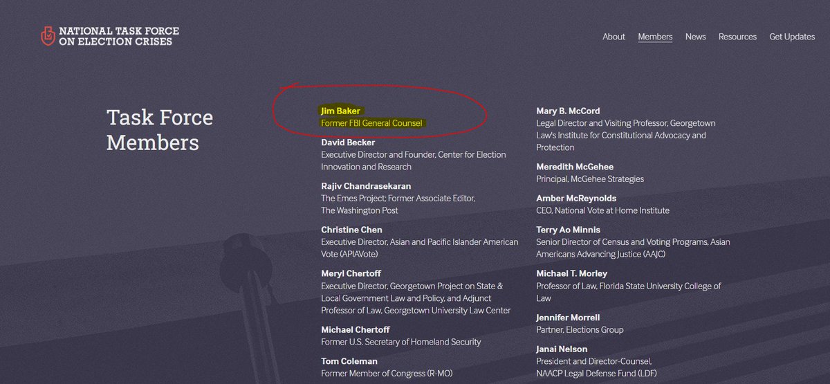 8. What is lesser known about Jim Baker, and which mainstream news is not currently appreciating, is that in the run-up to the 2020 election, Baker was also leading the National Task Force on Election Crises (NTFEC).