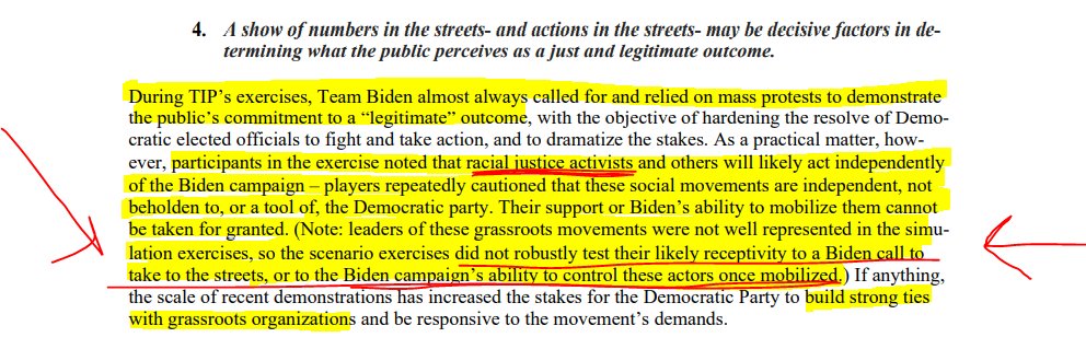 12. Just so no one misses the fine print, TIP sought to mobilize "racial justice activists" for "a Biden call to take to the streets," probing "the Biden campaign's ability to control these actors" if street muscle was needed to destabilize a Trump election win: