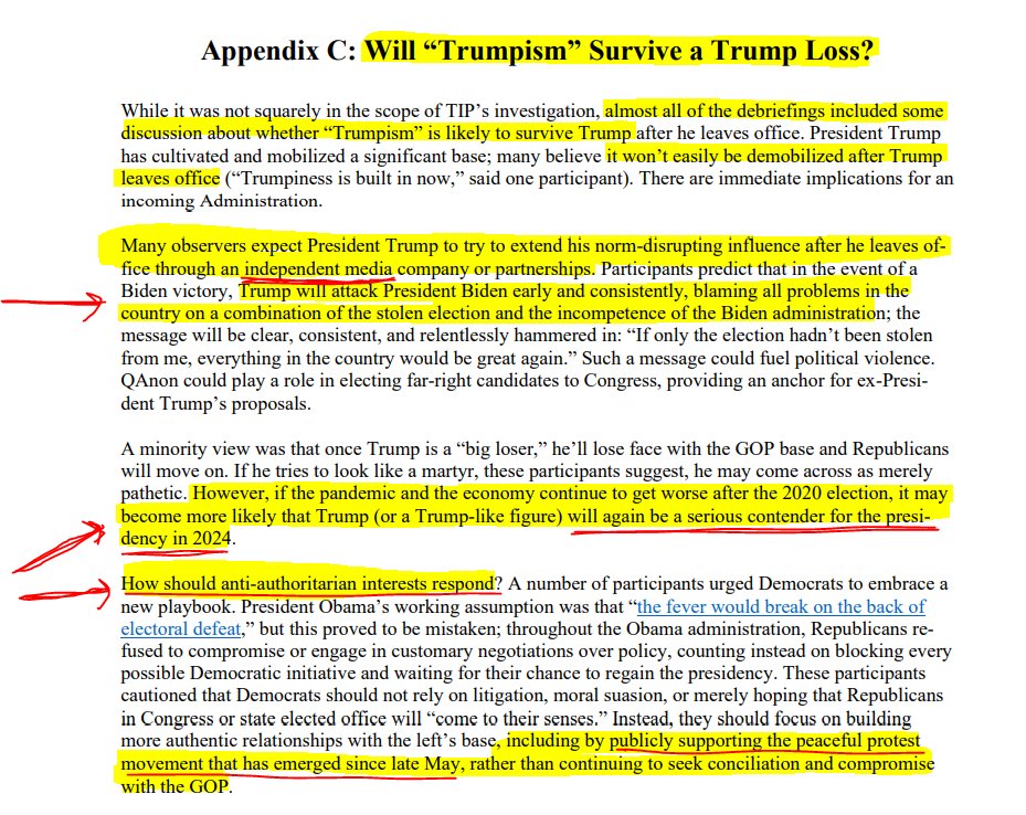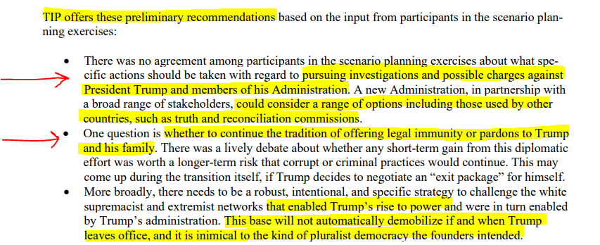 14. Even in August 2020 (when TIP published their election crisis blueprint), they were plotting "investigations and possible charges" against Trump and ending the "the tradition of offering legal immunity" to past Presidents.