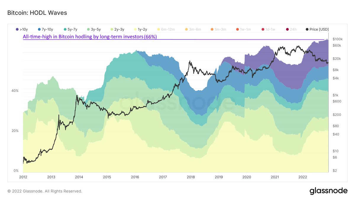 We have an all-time-high in long-term hodling. Those keeping Bitcoin at least 1 year now represent more of the network than ever before, 66%. Prior peaks of long-term holding all aligned with bear market toughs.