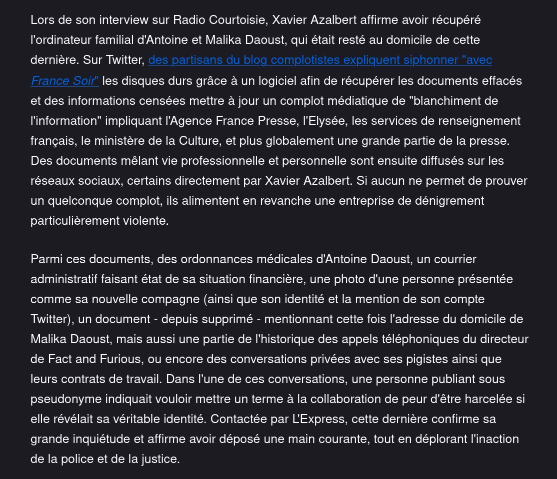 Surtout es personnes ont vu certaines de leurs données personnelles et de leurs conversations livrées à la bande à Azalbert et Aberkane. Cela dans un contexte de menaces et de harcèlement que je n'ai pas besoin de détailler ici.