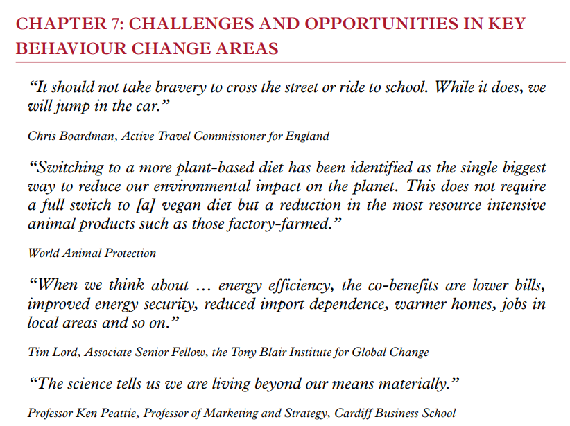 "Departments from across government should use the full range of policy levers—incl. regulatory & financial (dis)incentives, development & adaptation of physical & choice environments, and communication & engagement—to enable changes to the most impactful climate [..] behaviours"