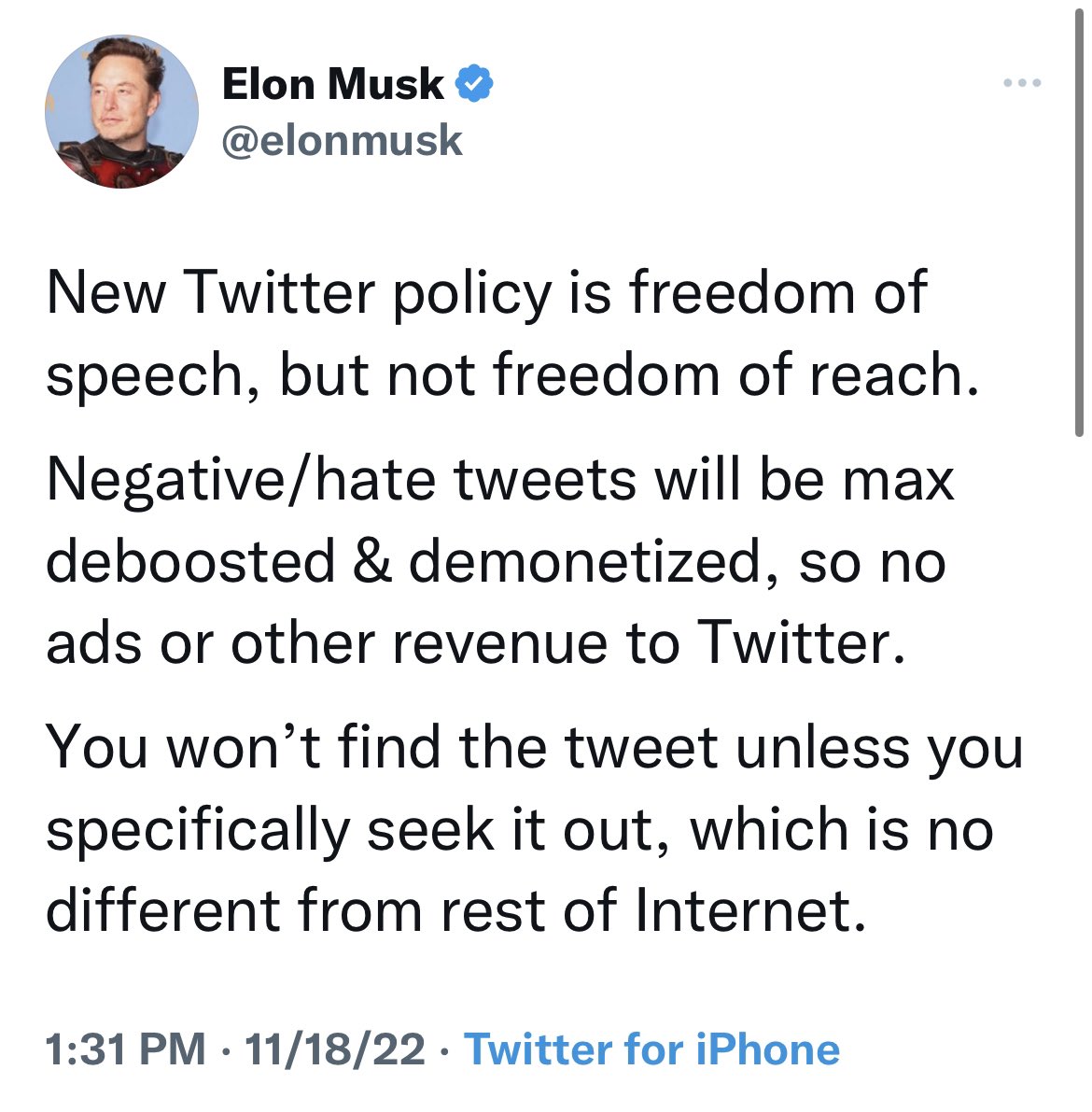 Way to keep it politically neutral and prevent those negative/hate tweets from being reached by too many people, like some douche canoe with over 110 Million “followers” (still 70% bots, which you are continuing to claim to be fundamentally against). #ElonIsADisgrace