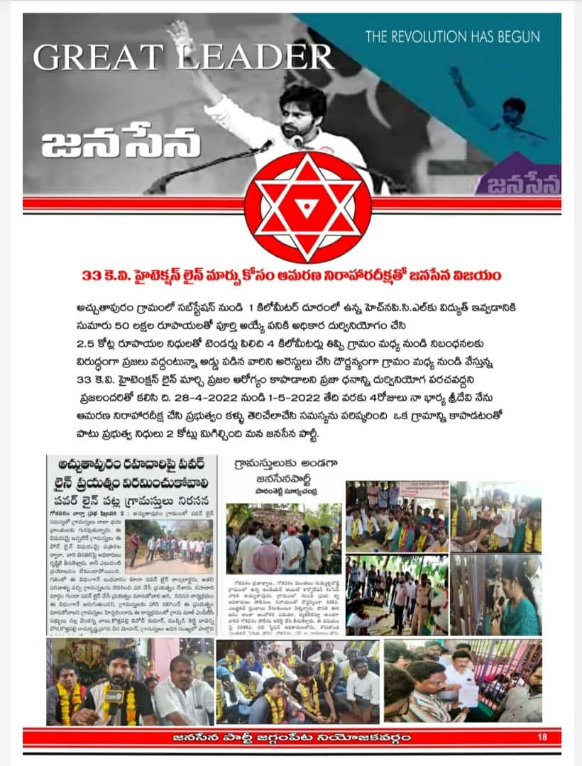17. ప్రజా సమస్యల పరిష్కారం - స్పందనలో 1600 ఫిర్యాదులు 18. అమరణ నిరహార దీక్ష - 33కేవీ లైన్ మార్పు 19. ఆమరణ నిరహార దీక్ష - ఉపాధి హామీ పథకం అమలు 20. విద్యార్థుల్లో అవగాహన #APNeedsPawanKalyan