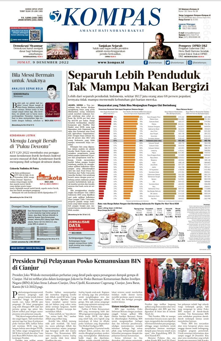 Saat di medsos kalian berseliweran postingan makanan enak dan mewah, ingatlah satu hal ini. Ternyata lebih dari separuh penduduk Indonesia, sekitar 183,7 juta orang atau 68 persen populasi, tidak mampu memenuhi kebutuhan gizi harian mereka. Silakan dibaca kompas.id/baca/investiga…
