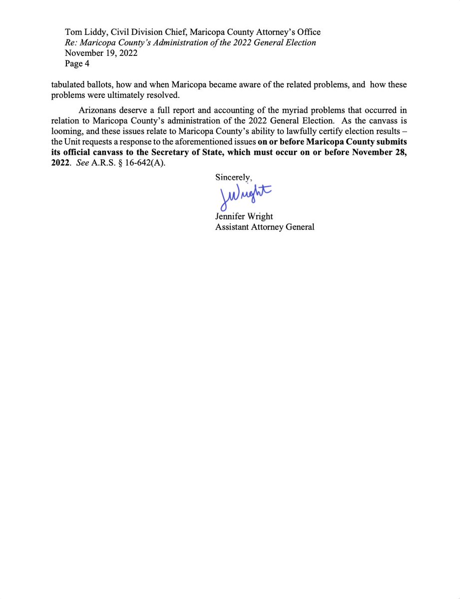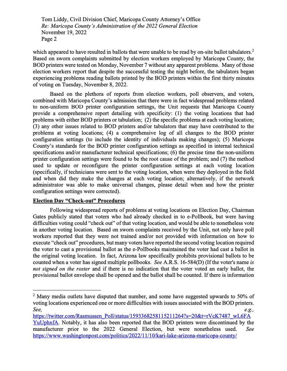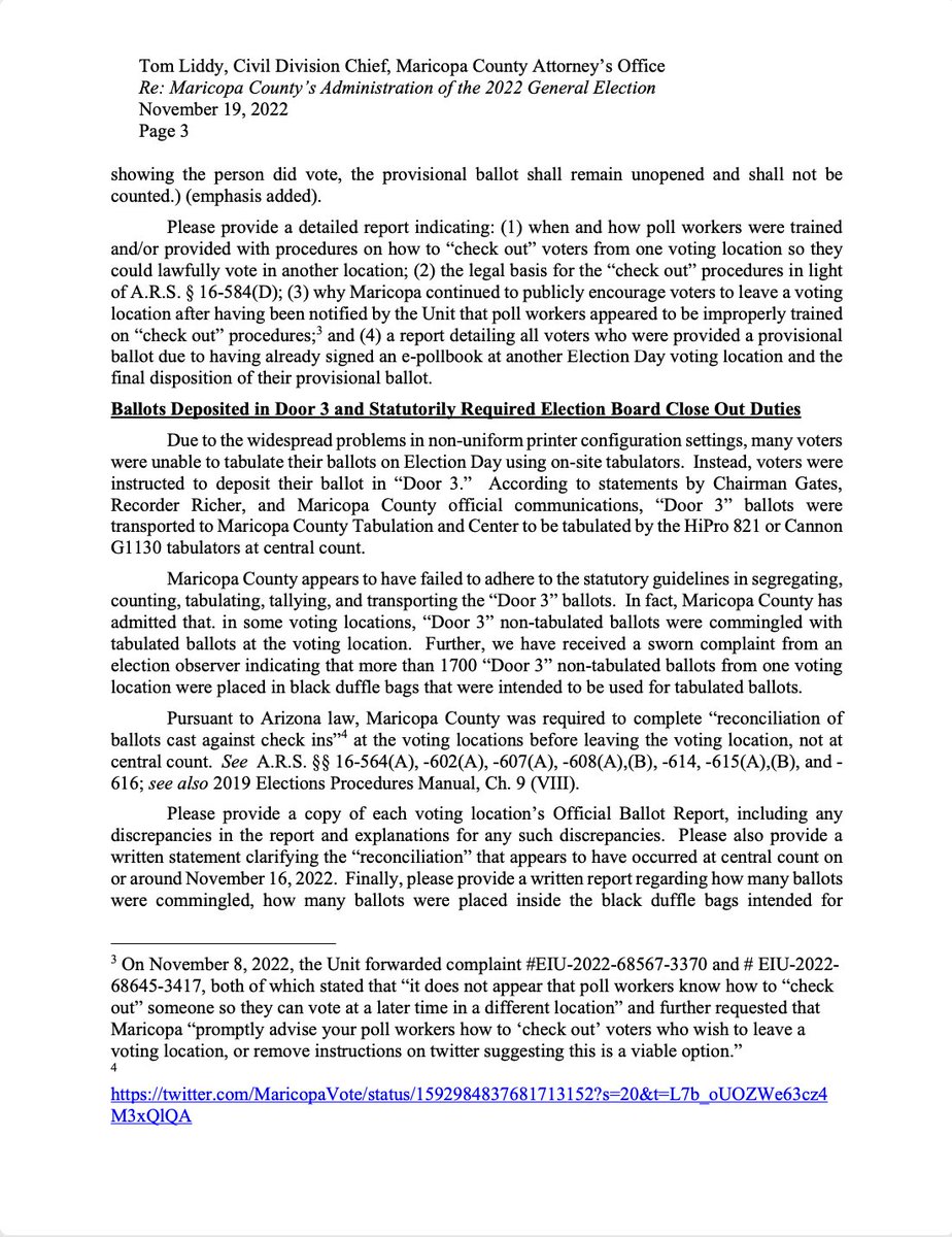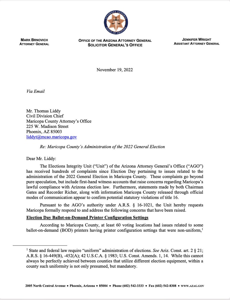 BREAKING: The Elections Integrity Unit of the Arizona Attorney General’s Office has officially demanded a response from Maricopa County "pertaining to issues related to the administration of the 2022 General Election in Maricopa County."