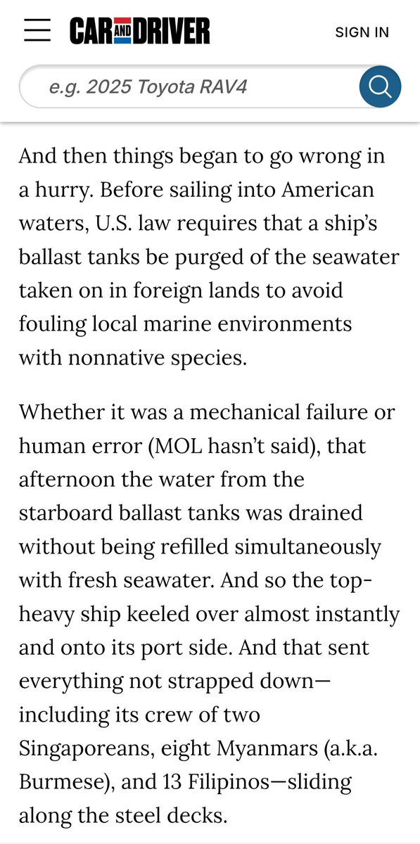 'That afternoon the water from the starboard ballast tanks was drained without being refilled simultaneously with fresh seawater. And so the top-heavy ship keeled over instantly and onto its port side.'