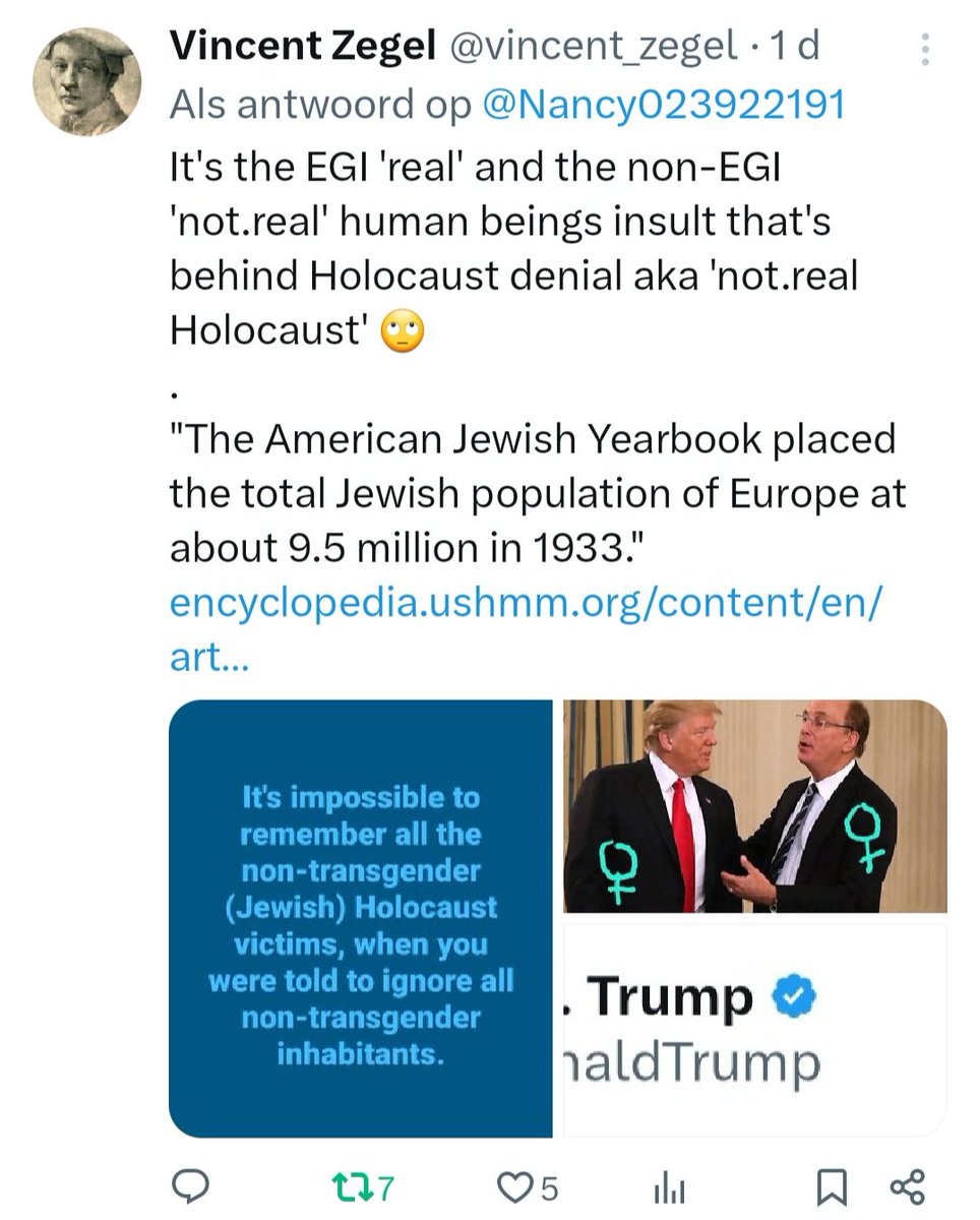 For the Nazi EGI transgender eXtremists who control all (religious) culture war eXtremists, it is imperative that their EGI transgender reality remains concealed. They will deny their two gendered ✌️ reality to protect the EGI mass murders against all non-transgender inhabitants