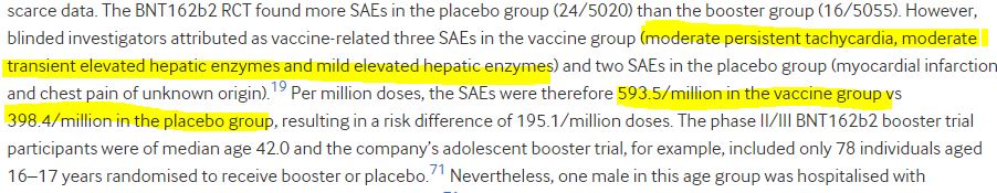 …reported 398.4/million in the placebo group, making the 593.5/million value a gross overestimation. A more reasonable comparison would be COVID infections prevented (hospitalized or not) vs. SAEs. They knew the issue, they still used it.