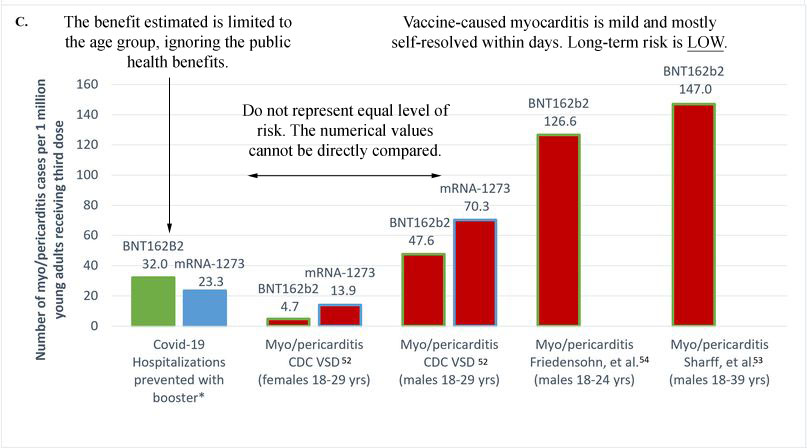 Figure 1c has the same idea but they plot against myo/pericarditis, which is the inflammation of the heart. They once again made it appear unbalanced while ignoring that these bars don't even share the same units (shouldn't be on the same chart, basic science here).