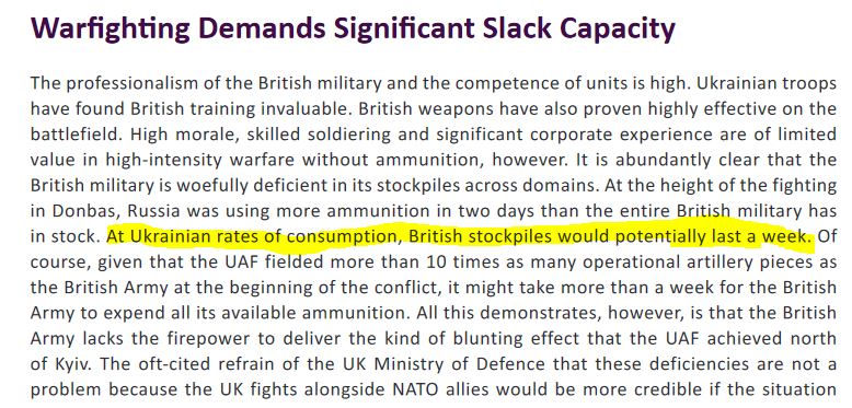 2/ A few things stand out in this paragraph. The first is that Britain - and likely other NATO countries - do not have ammunition stockpiles. Britain's wstockpile would apparently last a week under the conditions in Ukraine.