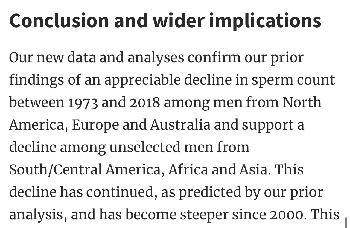 1/ Falling sperm count in men is seen as a cranky topic. But the evidence keeps piling up. Recently the largest metastudy ever conducted was published and the results speak for themselves.
