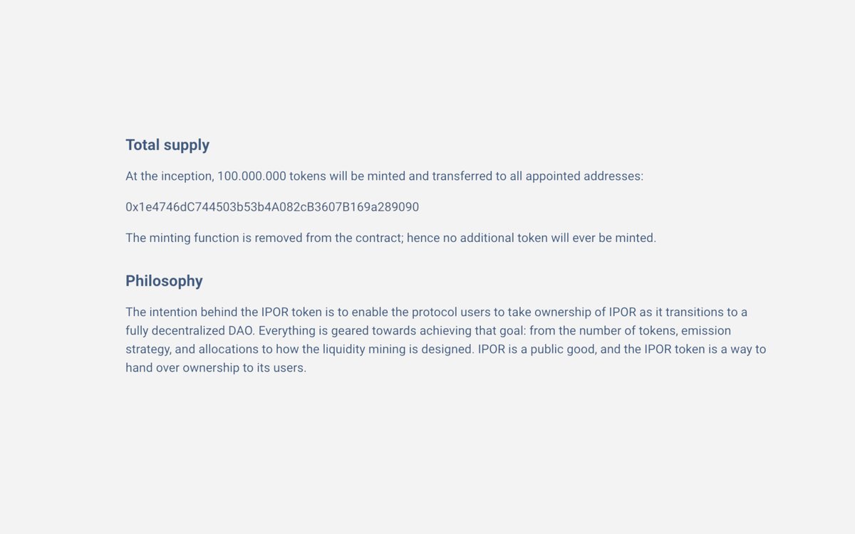 The IPOR token is the protocol's native token issued to the parties involved with the project: builders, investors, protocol users, and the like. It's an ERC20 token issued on L1 Ethereum with a Total supply of 100M.