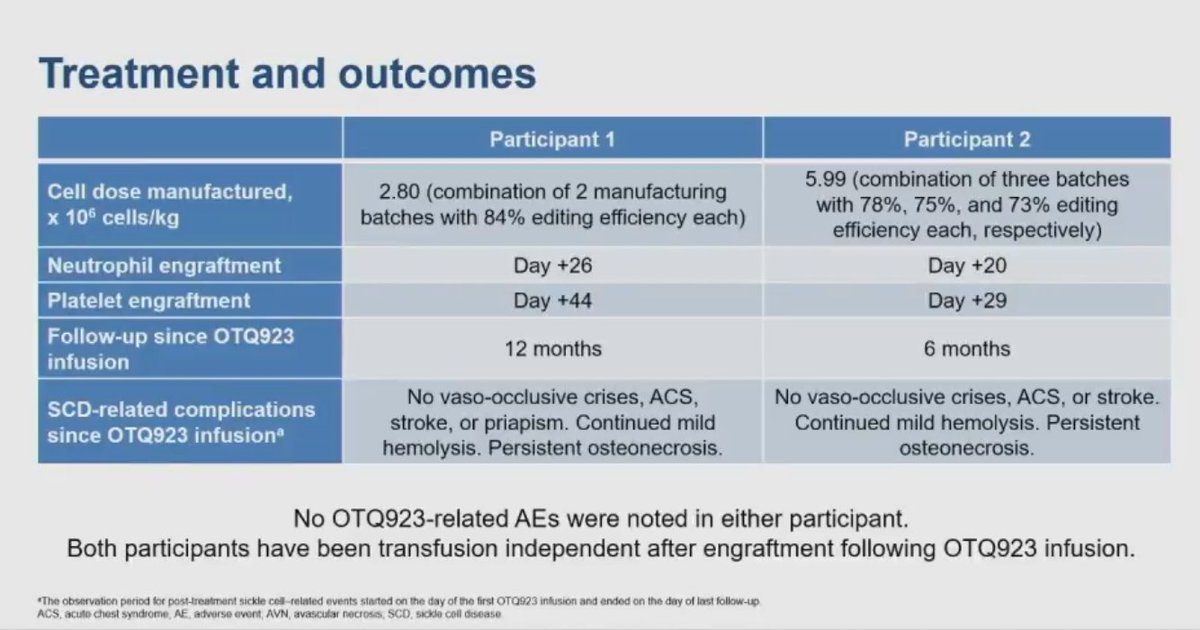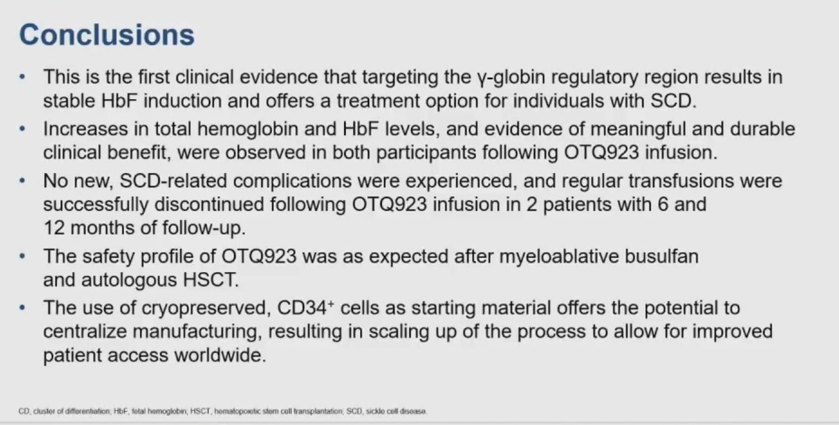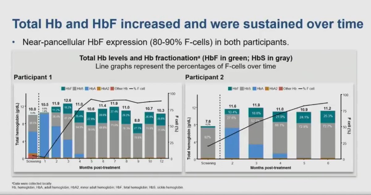 @AkshaySharmaMD These patients had exchange pRBC transfusion x 2 months at least, then mobilized, busulfan based conditioning, and then at least 2 years (and at least 13 more in long term study). So far 3 pts have been infused, today presenting 2 of those with 6 mo of f/u. #ASH22 3/n