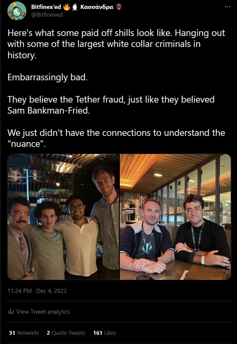 Bitfinex/Tether essentially used tethers so-called reserves to cover up an $850 million dollar loss for bank fraud and money laundering, and then Bitfinex/Tether needed a crypto-bailout. The same bailout that SBF/FTX was hoping for.