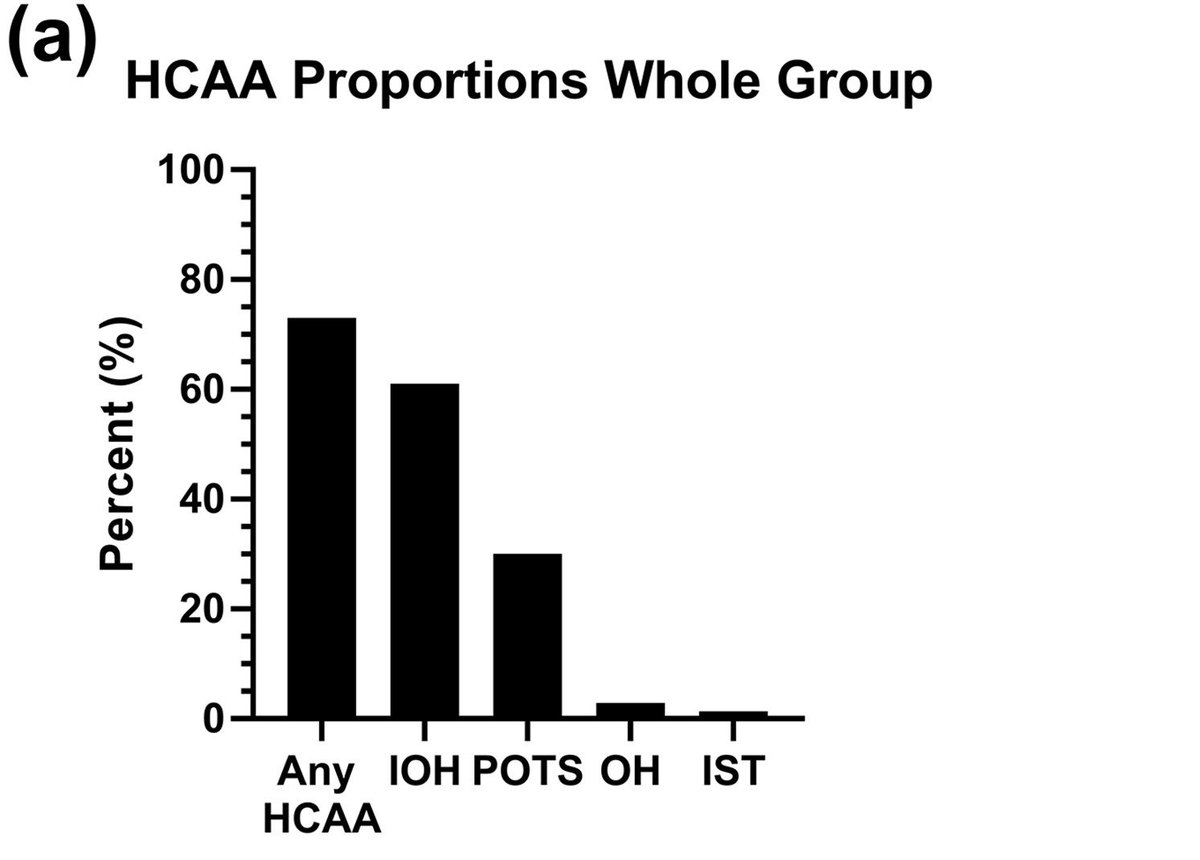 hämodynamische Anomalie (61 %). In früheren Studien wurde in der Allgemeinbevölkerung eine IOH von 15-30 % beobachtet, was darauf schließen lässt, dass IOH bei Patienten mit PASC häufiger vorkommt. Die IOH erfordert einen aktiven Stehtest mit Überwachung des Blutdrucks und der