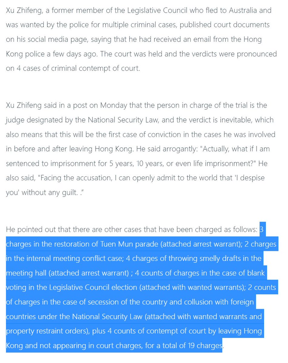 (5) the court also issued an arrest warrant for former legislator Ted Hui, who is now living in Australia as a fugitive, who is wanted for evading 19 charges