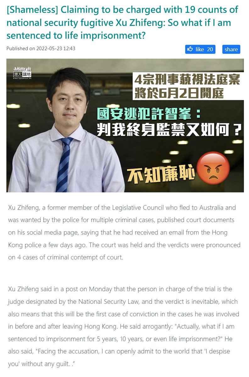 (2) Chui Hoi-chun, an 18-year-old part-time waiter, was convicted of for parodying “March of the Volunteers” on social media in the 2nd conviction under the national anthem law, as well as for charges of insulting the flag & publishing seditious remarks