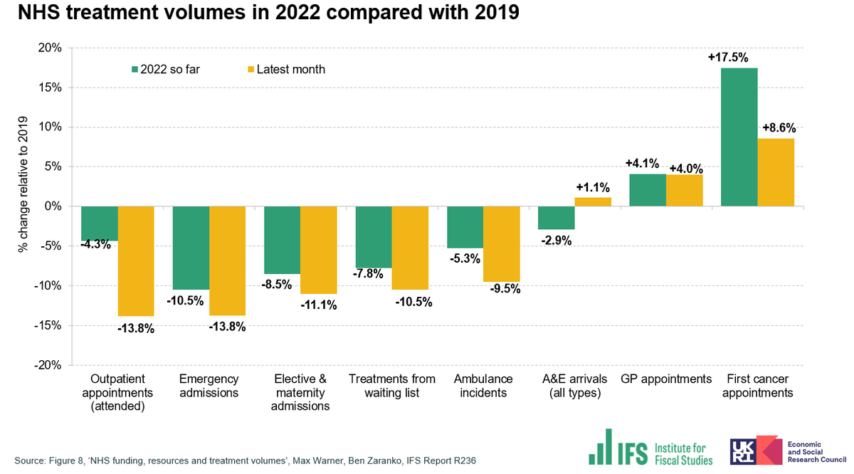So, any given increase in NHS funding is now more difficult to achieve – and persistent Covid impacts mean we might have to expect the NHS to treat fewer patients with that funding. That's not inevitable, but would pose major challenges for health and fiscal policy.
