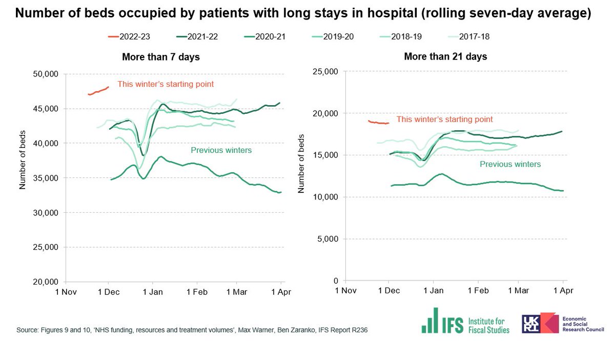 One symptom of that: the number of beds occupied by patients who have been in hospital for more than 7 days is 14% higher than at this point last year. The number occupied by patients who have been in for more than 21 days is 24% higher.
