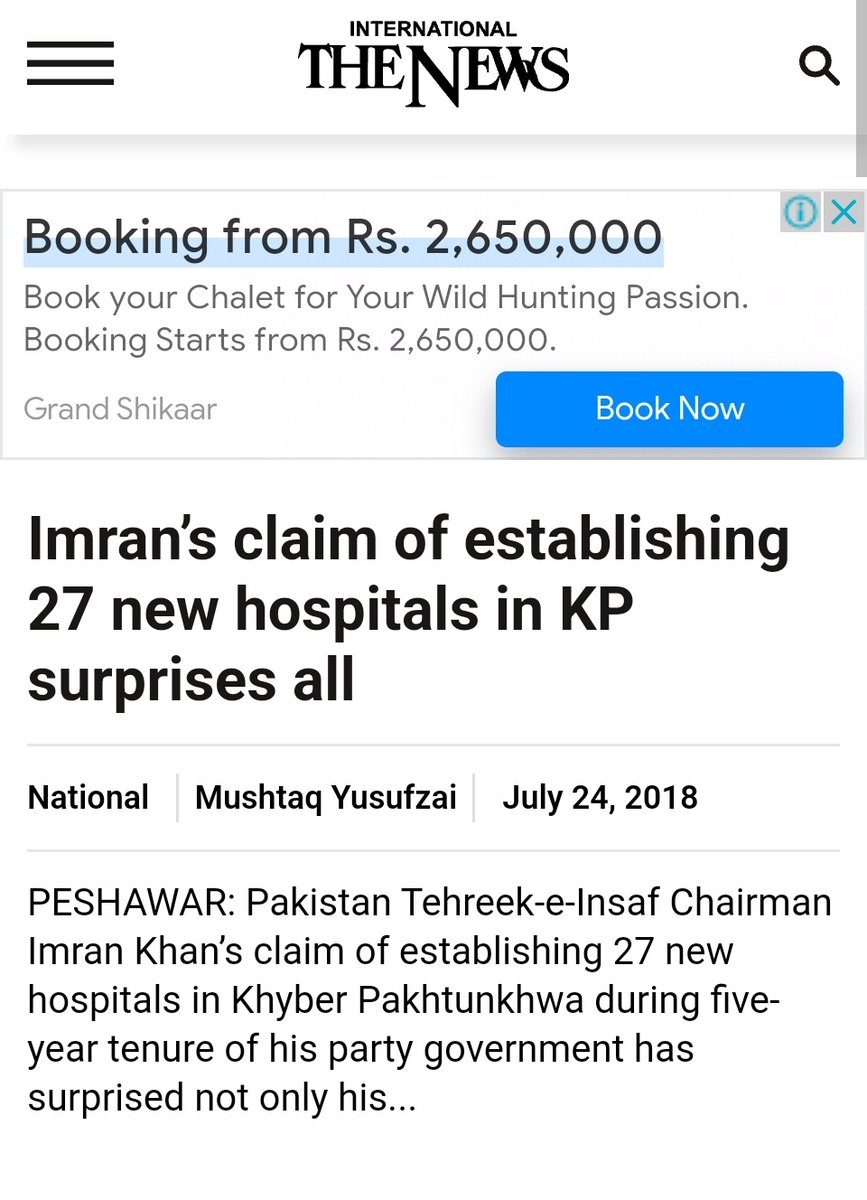 کے پی میں صرف ایک ھسپتال کی ایکسٹینشن کے علاوہ پنجاب،اسلام آباد،کے پی میں اپنے دور حکومت میں پی ٹی آئی حکومت ایک ھسپتال تک نا بناسکی.نو ھسپتال بنانے والوں کا اس سے بڑا جھوٹ کیا ھوگا کہ بہاولپور میں آخری ھسپتال نون لیگ کے دور حکومت میں سول ھسپتال بنا۔