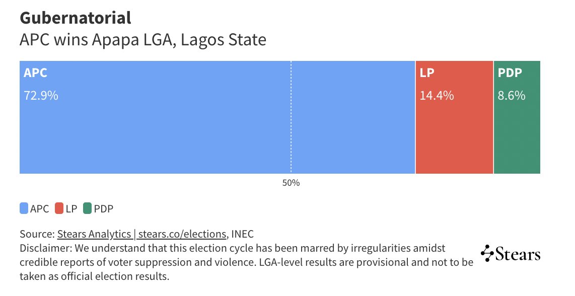 For context, in Ikeja, where the LP won the presidential elections with 30,004 votes to the APC's 21,276 votes, the APC has now won the same local government with 32,273 votes to the LP's 15,174 votes.