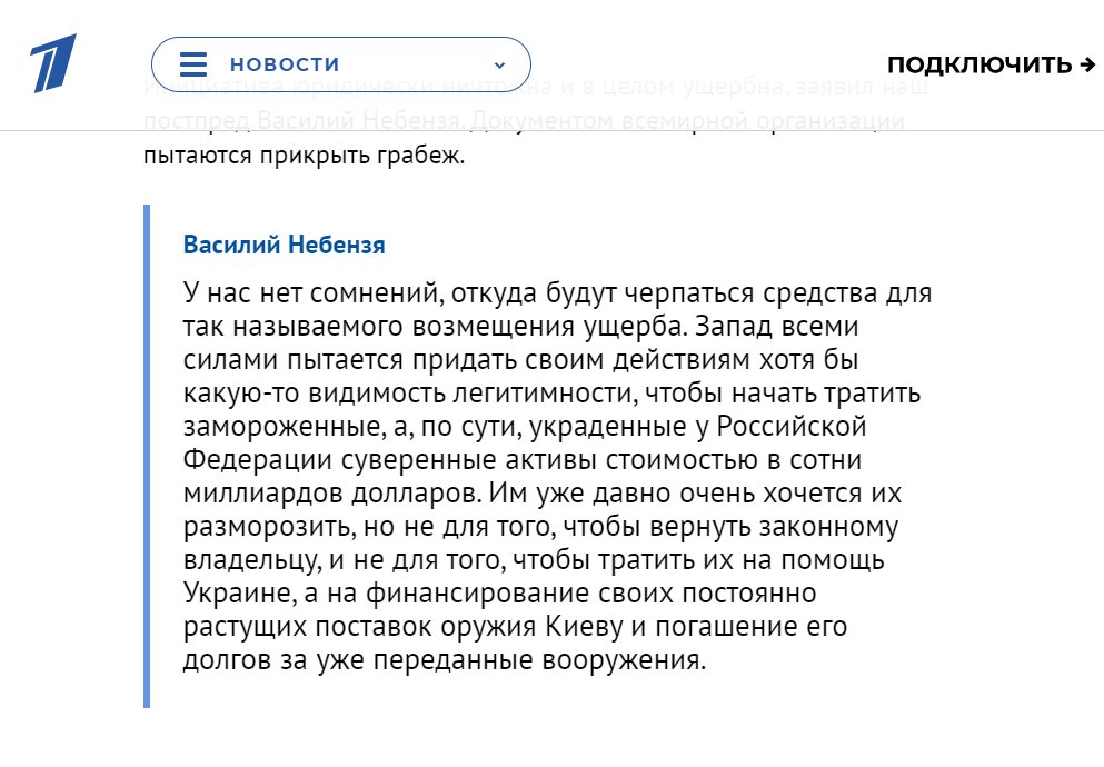 Russia’s Permanent Representative to the UN Vasily Nebenzya stated that “the West is trying to give its actions at least some semblance of legitimacy to start spending hundreds of billions of dollars of sovereign assets frozen, and, in fact, stolen from the Russian Federation.”