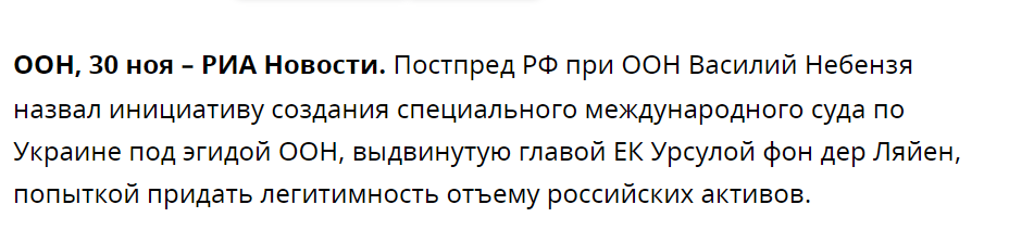 Citing 🇷🇺 UN Ambassador Nebenzya, 🇷🇺 state-run outlet RIA Novosti wrote that the current initiative of European Commission President Ursula von der Leyen to set up a specialised court to prosecute #RussianWarCrimes is nothing more than “a desire to grab frozen Russian assets.”
