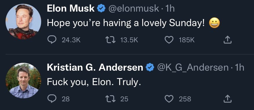 Koopmans' mede-auteur van het gedebunkte Worobey cs artikel, Andersen, kreeg 15mln van Fauci. En is niet blij met Musk die wat aan het trollen is.