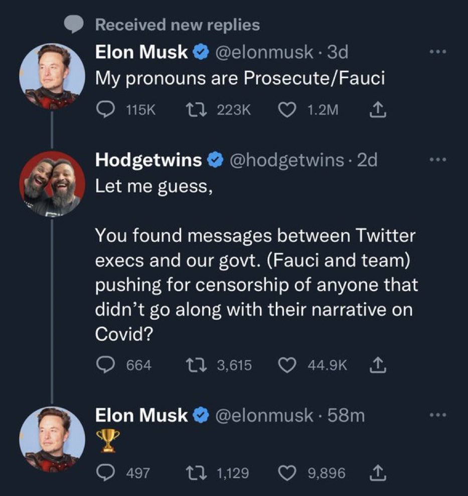 Musk weet nu natuurlijk meer, nl over censurering door twitter van #OriginOfCovid door Fauci cs.