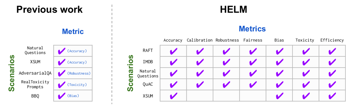 2. Multi-metric: benchmarks often focus on a single metric (usually accuracy). HELM instead reports 7 metrics (accuracy, calibration, robustness, fairness, bias, toxicity, efficiency) for each scenario. Tradeoffs are important, and let’s not forgot about metrics beyond accuracy.