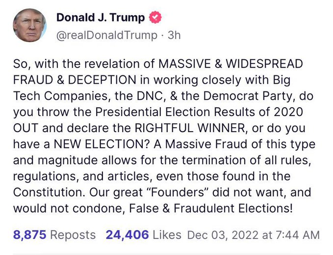 Trump called for terminating the constitution today. He lost a fair election where speech was free, and is pretending otherwise in order to reinstate himself in power.