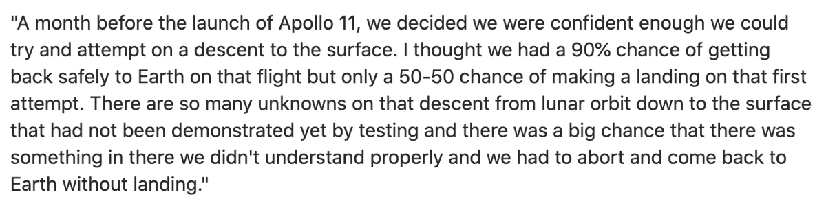 The reason it's taking 50 years to get back to the moon is because our risk tolerance has changed. In the original Apollo missions, they estimated the astronauts had only a 90% chance of surviving.