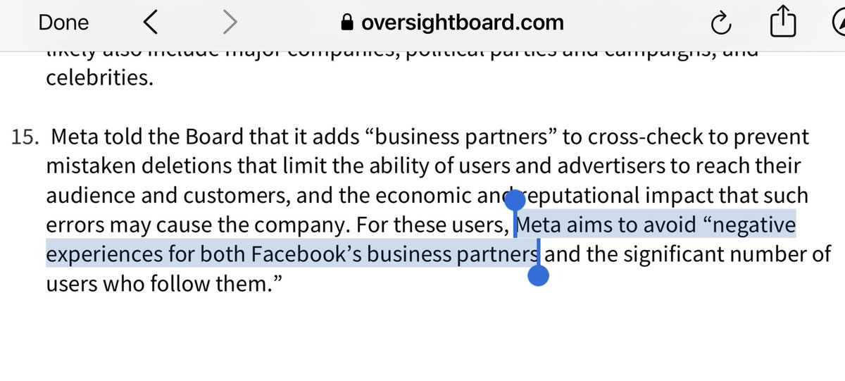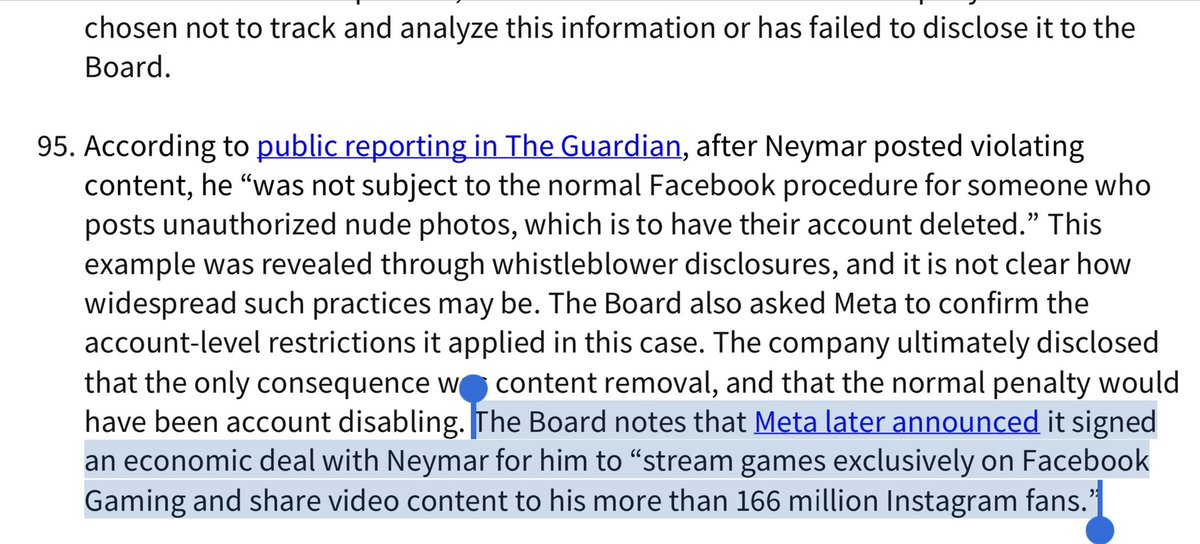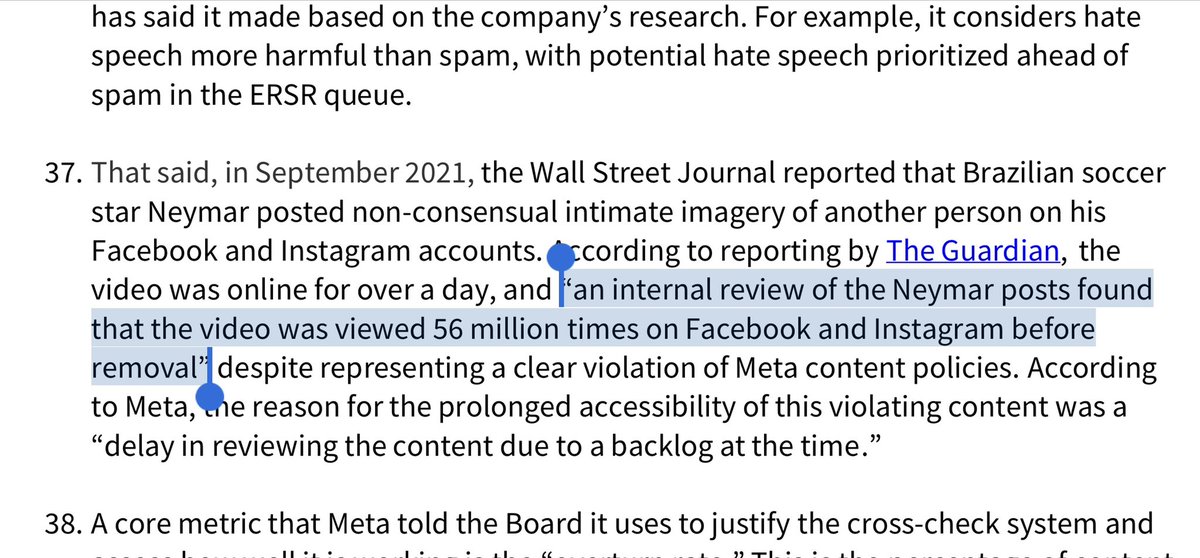 Wow. Facebook’s “oversight board” just released a 57pg scorching report on its cross-check” program with sugar coated all over it. Remember, this is the whitelisting program WSJ reported allowed Neymar to get away with posting “revenge porn” for a day - and 56 million views. /1