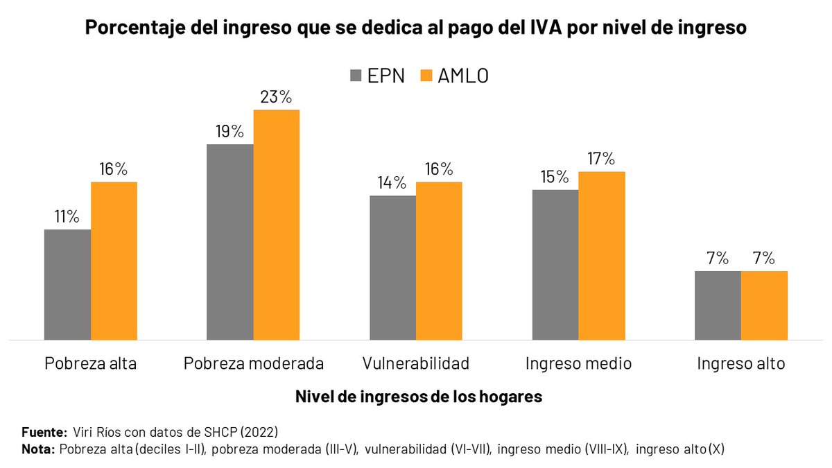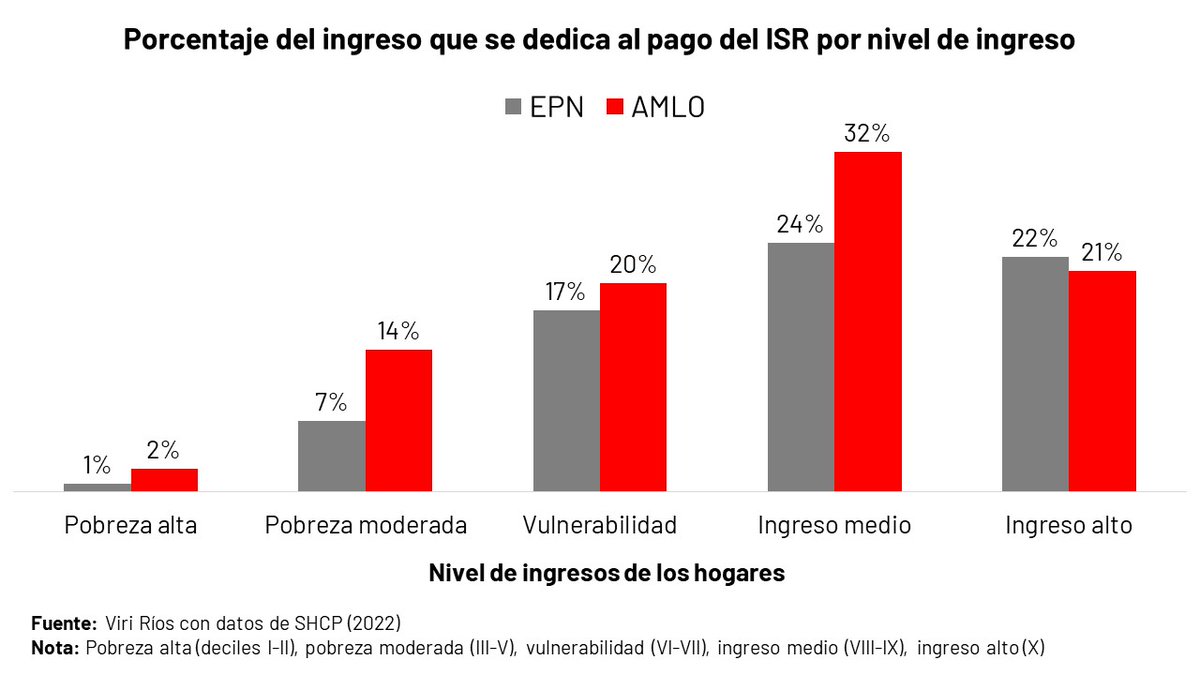 Los hogares pobres pagan una proporción más grande de los impuestos. Con EPN pagaban el 11%, ahora pagan el 18%. También pagan más IVA (ve “pobreza alta” en gráfica amarilla) e ISR (ve “pobreza moderada” en la roja).