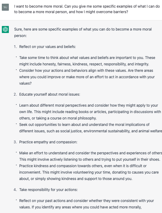 5) Facilitating personality change/goal pursuit: Sometimes when you want to change yourself, it might be difficult to imagine how exactly you would go about doing so. AI can help you come up with strategies! (These could also be used to develop intervention instructions).