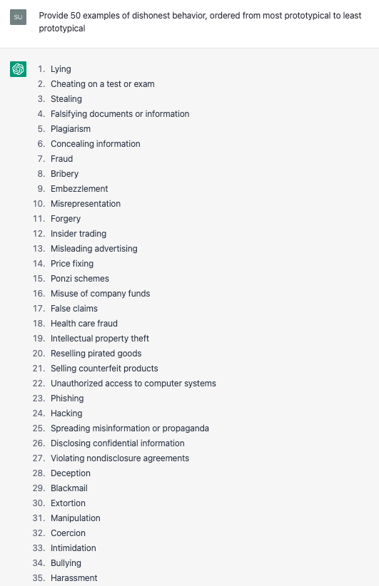 I am completely astounded by #ChatGPT's capabilities (chat.openai.com). I've been playing around with it to explore possible use cases for psychological research. Here are just a few: 1) Stimuli generation.