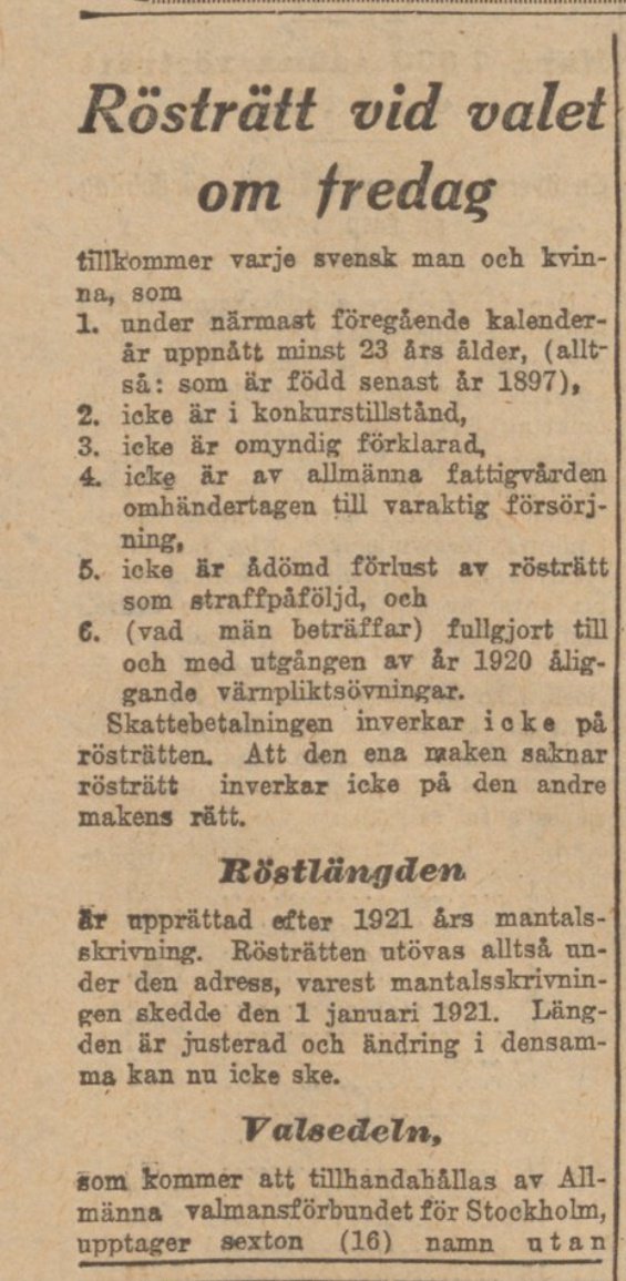 Så vid riksdagsvalet 1921 fick även kvinnor (för första gången) rösta. Listan nedan visar dock att det fortfarande fanns en hel del begränsningar.