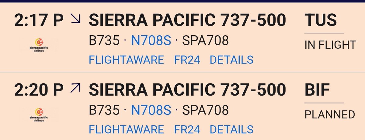 A Sierra Pacific Airlines 737 SPA708 reg:N708S (#A973D6) is coming to #KMDT from #KTUS. Looks to be a chartered flight, probably by the Feds. DoD has a contract with them, but I wonder if this an ICE flight. ICE flights by another charter line iAero are common at Harrisburg Int'