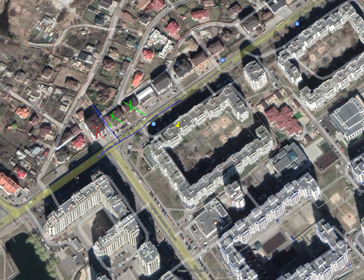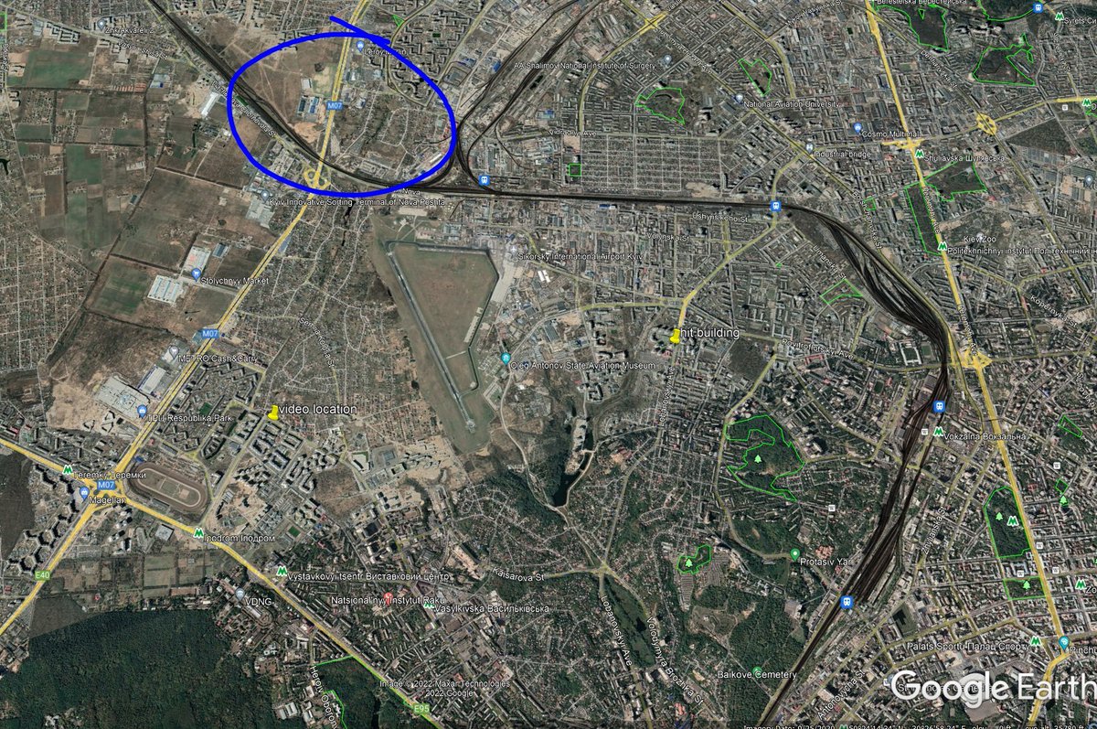 A few others and I quickly geolocated this video to a neighborhood south of Kiev and near Sikorsky International Airport. This video also shows the missile trail arcing towards where the building was hit.