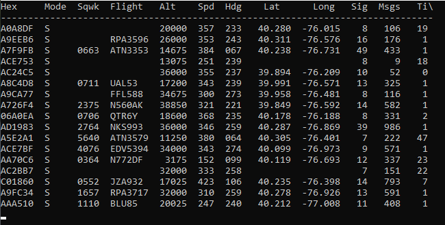 ADS-B out transponders, emit a pulse of information about an aircraft once every second on either 1090 or 978 Mhz. The information includes a plane's unique ICAO hex code, its callsign, speed, altitude, heading, & current GPS cords. Below is an example of raw ADS-B data. 3/X