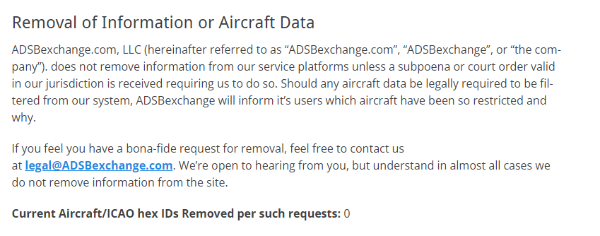 This means services like ADSBexchange, which does not use FAA data and instead have users submit their own, have no legal responsibility to block aircraft on the FAA's LADD list. For example, ADSBexchange is block-free and has never removed an aircraft from its service. 14/X