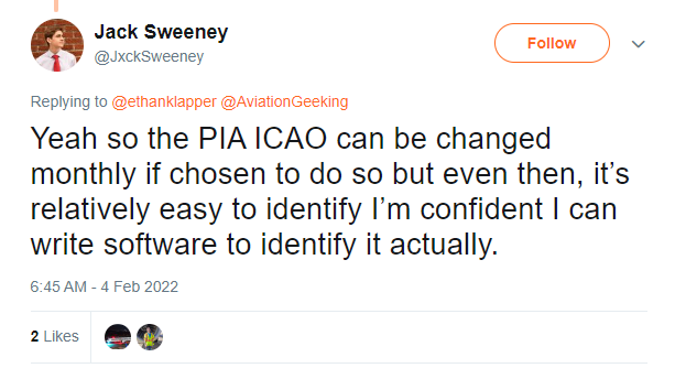 This is exactly what happened to Elon Musk's jet. After Elon first tried to have @ElonJet taken down and was unsuccessful, he then opted into the PIA program to try to prevent the tracking. Jack Sweeney, the operator of the account, was able to find the new hex quickly. 18/X