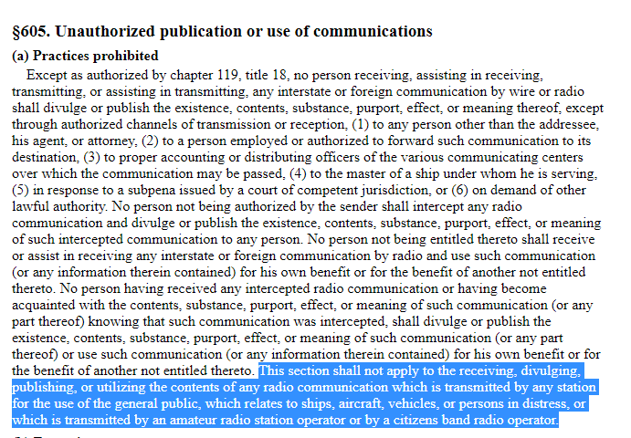 Furthermore, Title 47 Section 605 of the U.S. Code clearly carves an exception and protection for the public dissemination of radio communications from aircraft. justice.gov/archives/jm/cr….