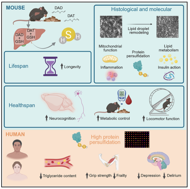 2/7) Garlic is rich in diallyl sulfides (DAS) — sulfur compounds that increase hydrogen sulfide (H₂S) levels. H₂S acts like a hormone: it diffuses through membranes, triggering cellular pathways across the body.