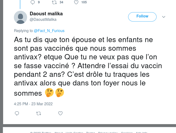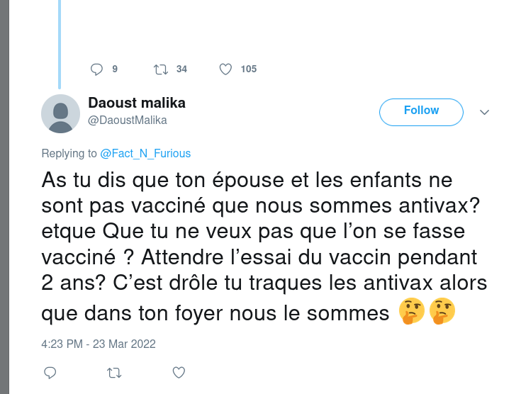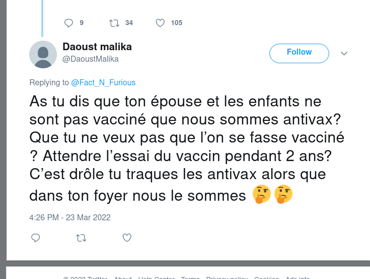 1 tweet où Mme M Daoust répète 2 fois "NOUS sommes antivax".