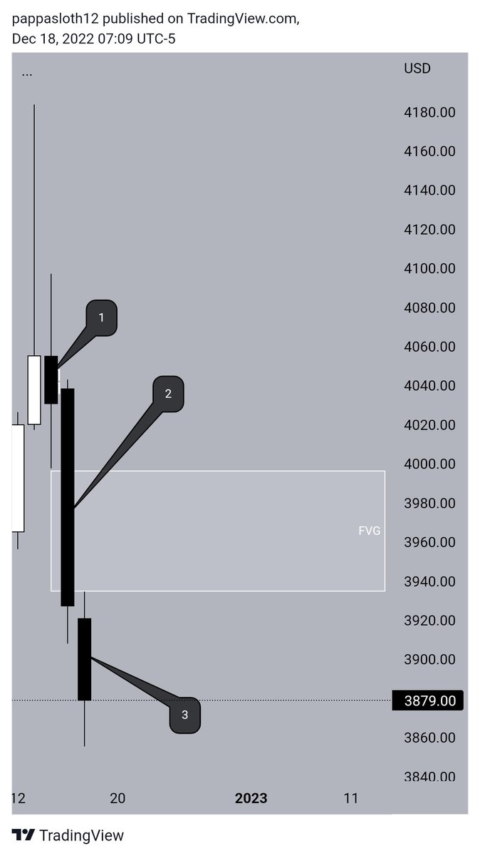 In this example, the FVG is formed by candle 2 leaving nothing offered to buyers between the low of candle 1 and the high of candle 3 causing an imbalance in the market.