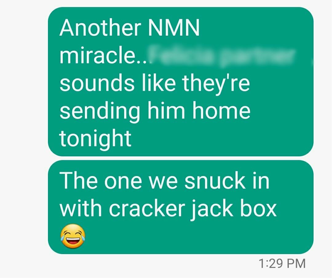 One wife even sneaks NMN into hospital for her husband who's just been vented the day prior & is at risk for venting again. He makes such a rapid recovery that Drs. are SHOCKED. He goes from vented to walking out of the hospital w/upper 90's oxygen, in less than a week. 7/20 Image
