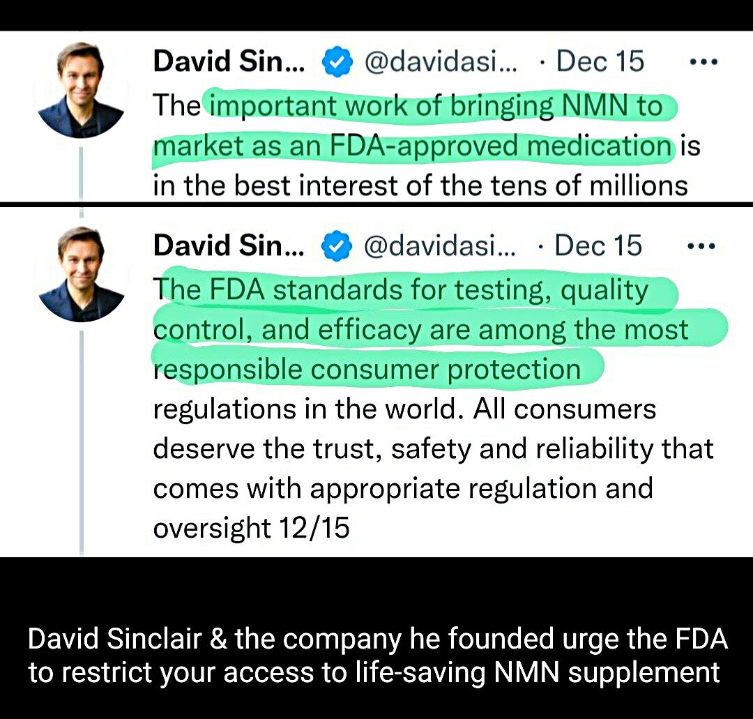 This move by MetroBiotech (& likely planned by David Sinclair, who's sold out to big Pharma before) could result in NMN being taken off market for MANY YEARS while testing's done. Then brought back "prescription-only" & likely 10x current cost. So David Sinclair can profit. 16/20