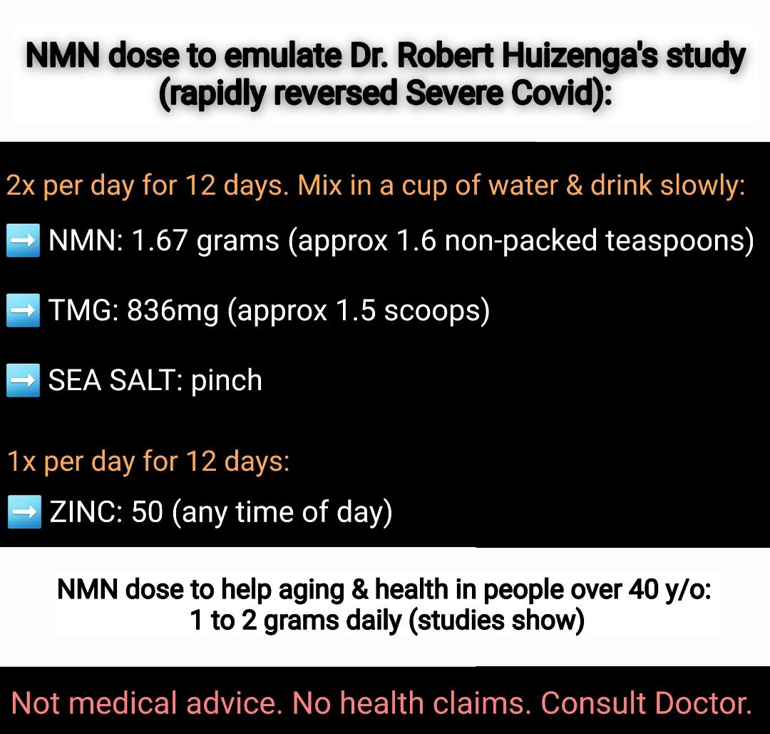NMN DOSE: in the study NMN was mixed w/water & a few co-factors that make the NMN work better--TMG (trimethylglycine), which is a natural compound found in beets, salt, & zinc. I did this for Covid clients w/amazing results. For general health, you'd take a smaller dose. 19/20 Image